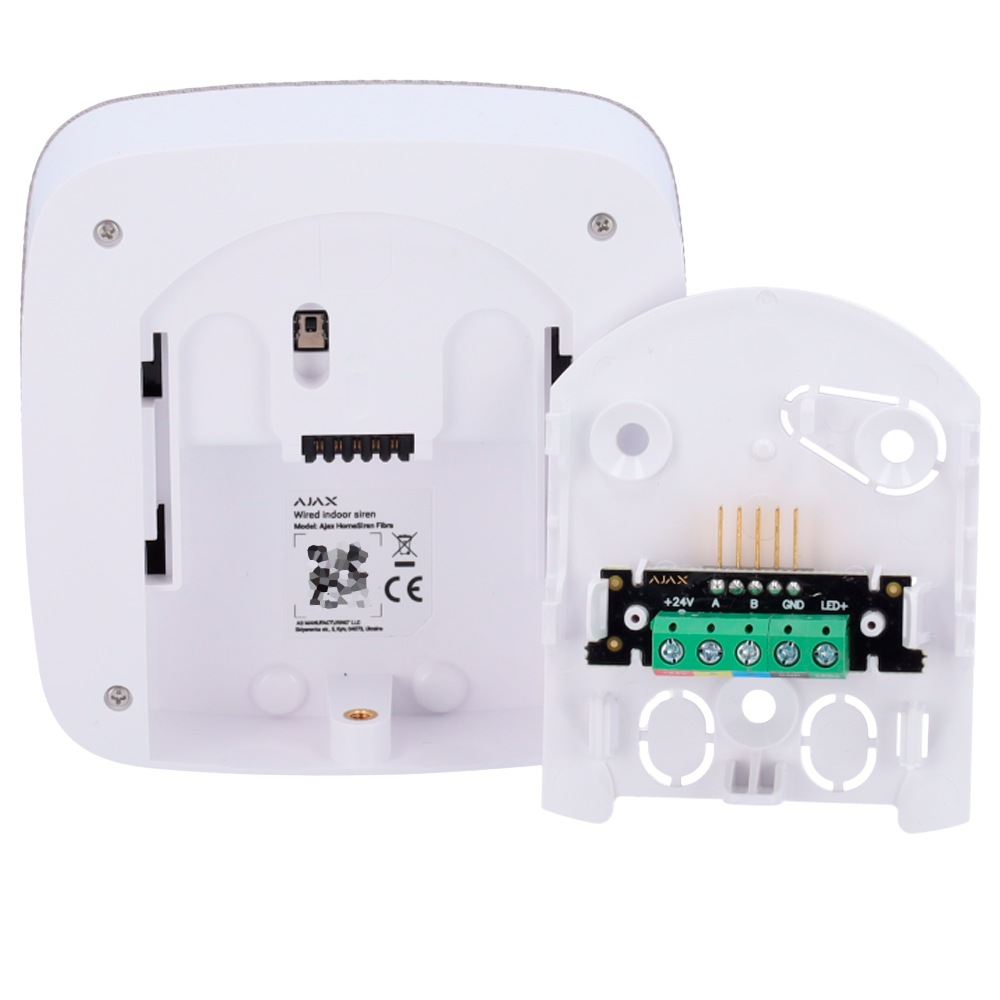 La FIBRA-HOMESIREN-W est une sirène intérieure filaire conçue pour les systèmes d’alarme Ajax Fibra.